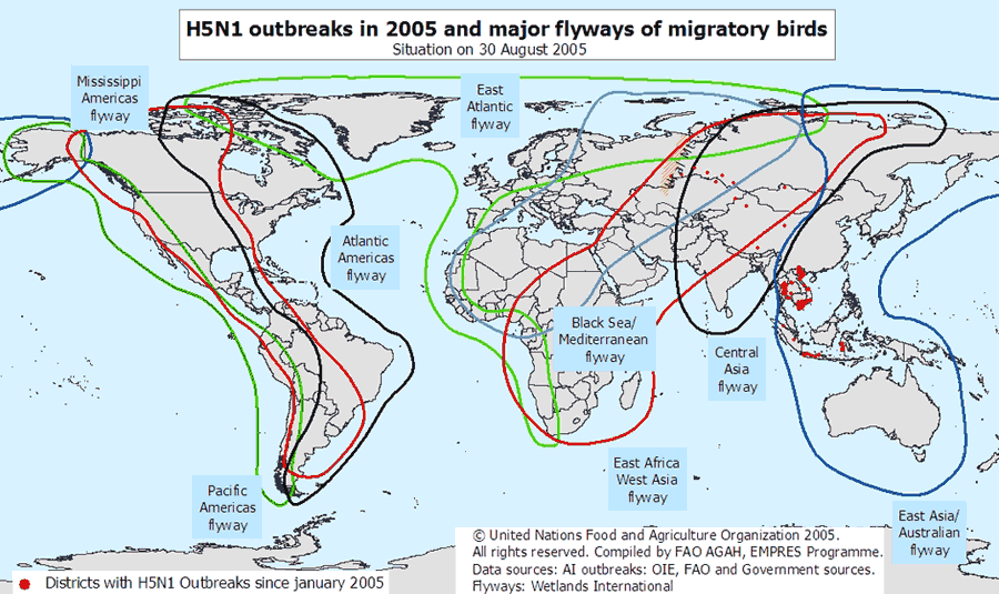 An example of surveillance was against the threat of avian influenza. This strain emerged in poultry farms and markets in China but became humanly transmissible owing to the proximity of the birds to humans. The global threat arose where the virus spread to migratory wildfowl. Seasonal movements of these birds, from Asia to Europe, would allow the virus to be carried over a vast range and introduced to European livestock. The risk of a pandemic was were subsequent transmissions to humans could arise. Knowing the migratory flyways allowed for surveillance en route to spot dead birds test for infection in those and live birds. This also forecast outbreaks in European farms which lead to the mass culling of potentially infected livestock.
