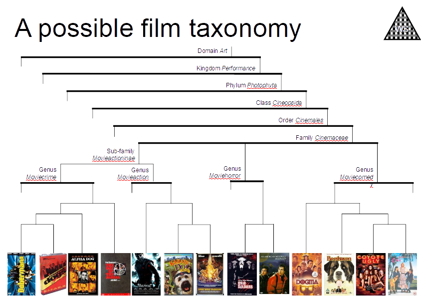 The mock-up tentetivly depicts a how a structure might look. It should be noted that the classification system was and still is incomplete as it should be constructed by consensus by a community of researchers. It shows a hierarchy of ranks with particular cultural objects (a cherry picked set of films) at the bottom as positioned with respect to a film genra. Owing to incompleteness in this example, the species (which could equate to either sub-genra or franchise) rank is not shown. The taxonomy shows some narrative cinematic releases, but could be extended to include other types such as documentaries, or instructional videos. A “dog” (maybe “toon”) Latin has been used playfully as a placeholder for naming taxonomic ranks showing how standard suffixes like “-aceae” could be used to denote the rank of family.